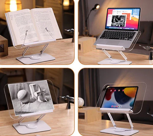 The 360 degree Rotatable Transparent Book Reading Stand is designed to enhance both the functionality and aesthetics of your reading and working space. With its minimalist and clear design, this stand combines elegance and durability, making it a sleek addition to any desk or tabletop. Ideal for users looking to optimize their comfort, the stand is versatile, supporting books, tablets, magazines, cookbooks, and even laptops. Its foldable design allows for easy storage when not in use, while the adjustable angle ensures you can position your reading material at a comfortable height, reducing neck and eye strain during extended use.